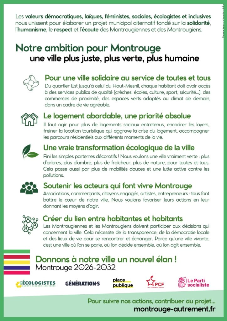 Face aux défis sociaux, écologiques et démocratiques, nous affirmons notre engagement pour une ville solidaire, juste et durable. Notre ambition ? Transformer Montrouge. Une ville solidaire, un logement abordable, une vraie transition écologique, un soutien à celles et ceux qui font vivre Montrouge.