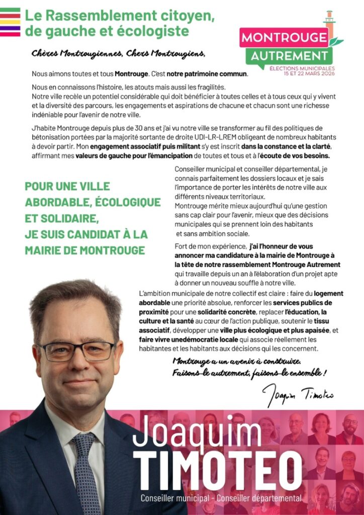 Les idées innovantes portées par ce grand rassemblement de la gauche, des écologistes, des démocrates et des citoyens et bâties suite à une belle concertation citoyenne sont une chance pour Montrouge et créeront une nouvelle dynamique. C’est pourquoi j’appelle avec conviction et enthousiasme à voter pour Joaquim Timoteo !