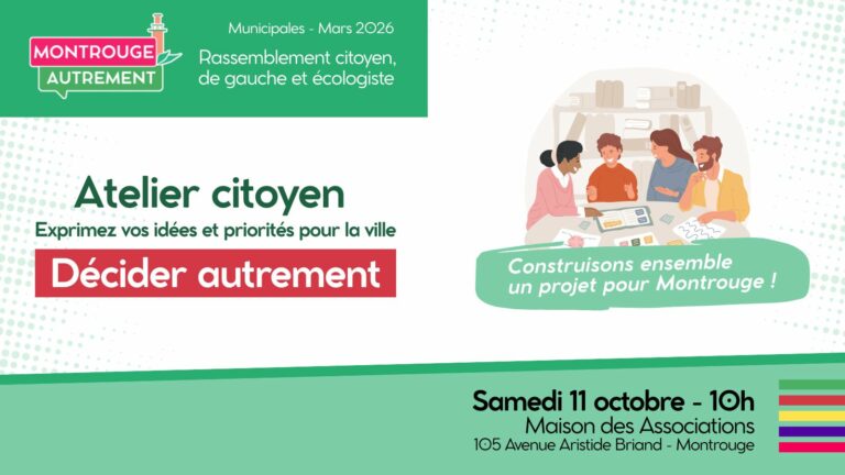 Montrouge Autrement vous donne rendez-vous pour son premier atelier citoyen » Décider autrement » samedi 11 octobre à 10h, Maisons des Associations, 105 Avenue Aristide Briand.