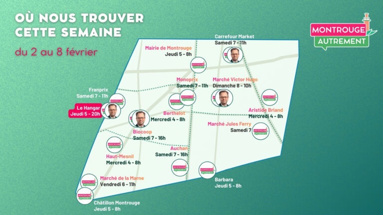 Venez nous rencontrer sur le terrain ! Venez discuter, poser vos questions, partager vos attentes et vos propositions. Notre équipe de campagne sera présente sur les points de rencontre indiqués ci-dessus lors de la semaine du 2 au 8 février.